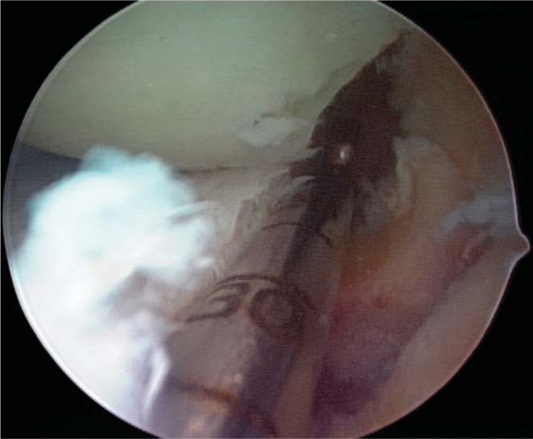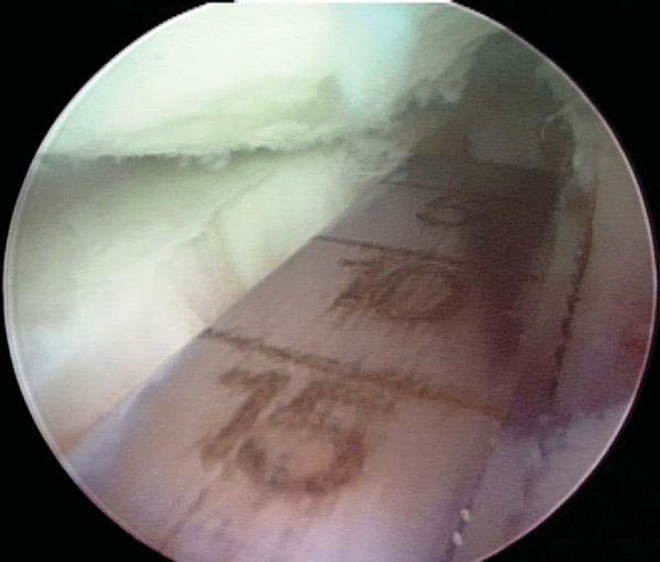 ). The most anterior aspect of the meniscus can be excised under direct visualization by use of a No. 11 scalpel blade placed through the ipsilateral portal followed by the use of an aggressive arthroscopic shaver. The anterior and posterior horn insertion sites should be maintained because they are helpful markers during slot preparation. A limited notchplasty along the most inferior and posterior aspect of the ipsilateral femoral condyle allows improved visualization of the posterior horn and facilitates graft passage.