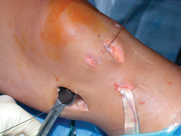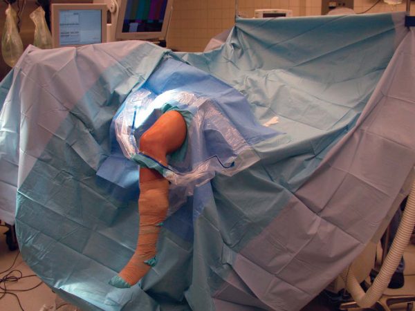 On the basis of the surgeon’s, anesthesiologist’s, and patient’s preferences, the procedure can be performed under general, spinal, or regional anesthesia or a combination thereof. The patient is positioned supine on a standard operating room table, with a thigh tourniquet, and the extremity is placed in a standard leg holder allowing full knee flexion or hyperflexion (