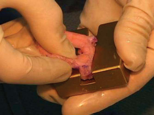 One of the main benefits of the dovetail method is the use of cutting guides to prepare the graft, rather than preparation of the graft by a freehand technique. As a result, it not only saves time but, more important, decreases the chance of an improper match between the recipient channel and graft. The graft is initially sawed so that the horn attachments are flush with the ends of the allograft bone, and the graft is marked with the dovetail template (