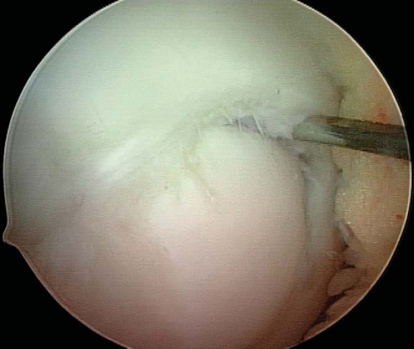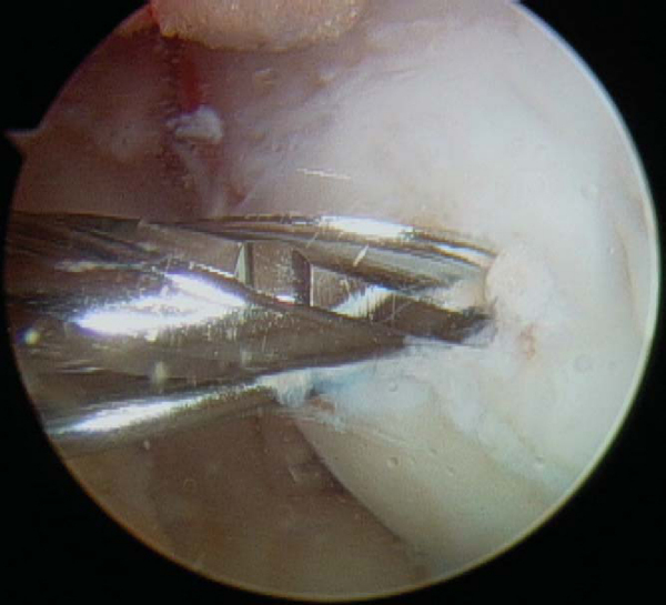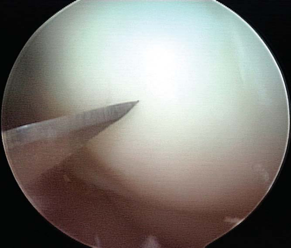 With use of the elbow of a standard arthroscopic probe, the boundaries and stability of the lesion are assessed. In many cases, the borders of the lesion are obvious, with fissuring, fibrillation, and even gross gapping in the articular surface (
