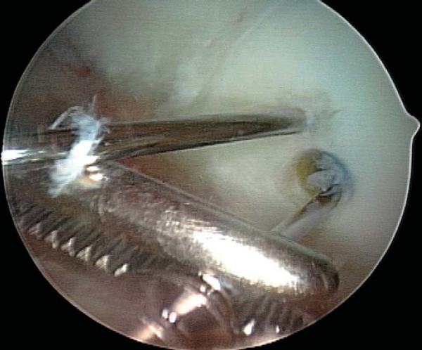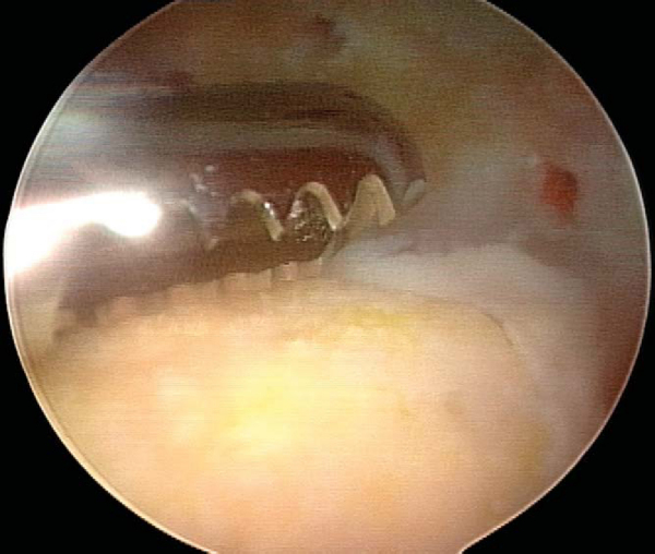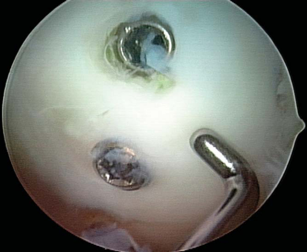 Use of nonabsorbable fixation typically requires a second procedure for implant removal. Implant removal can almost always be accomplished arthroscopically, regardless of whether initial fixation was obtained by open or arthroscopic technique. A diagnostic arthroscopy is performed to re-evaluate the joint and to assess healing of the lesion by arthroscopic visualization and palpation. Spinal needle localization is used to establish the appropriate vector for implant removal (