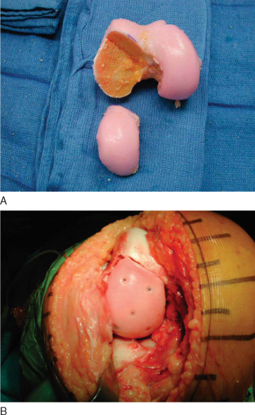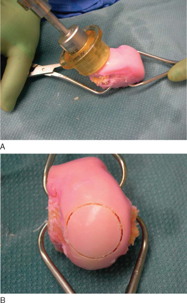 ). The graft is then amputated from the condyle with a cut at its base by an oscillating saw. The previously measured recipient site depths are marked at the four corresponding quadrants of the graft. The graft is placed in a special bone holder, and the oscillating saw is used to make the final cut at the marks. Fine adjustments can be made with a bone rasp. To reduce its immunogenicity, the graft is then copiously irrigated with bacitracin solution by the jet lavage system to remove any remaining bone marrow elements (