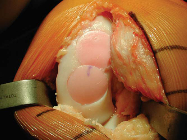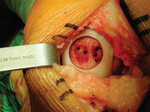 With the appropriate orientation, the allograft dowel is manually inserted and gently tapped in place until flush. If necessary, the recipient site can be opened up farther with an oversized dilator. Fine adjustments to the allograft are made. An excellent press fit is typically noted (