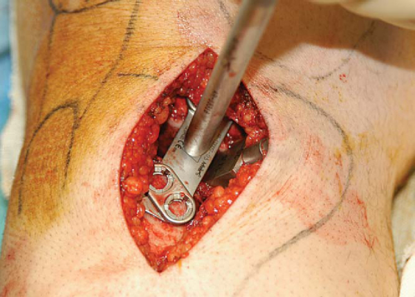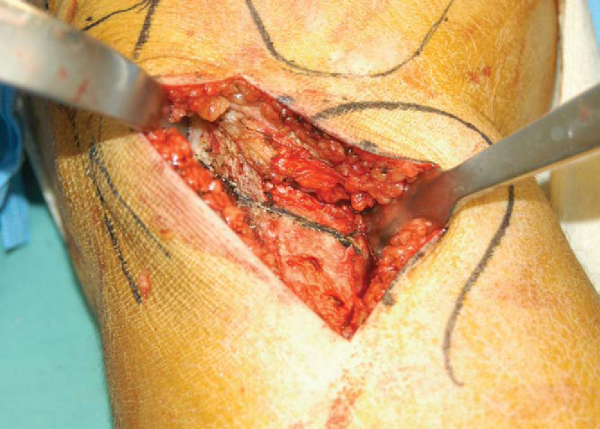 ). The wound is irrigated, and the pes anserine and sartorius fascia are repaired over the plate. The subcutaneous tissue is reapproximated, the skin is closed and a dressing applied.