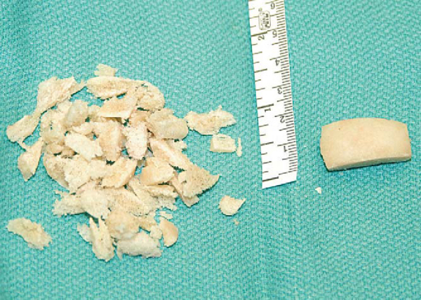 ). Femoral head allograft is then morselized and placed into the wedge defect. A corticocancellous wedge is then placed just anterior to the plate to help maintain the open wedge (Fig. 58-12 and 58-13 [12] [13]). Autologous iliac crest can be used, but this can lead to donor site morbidity. Final images are obtained to ensure proper hardware placement (