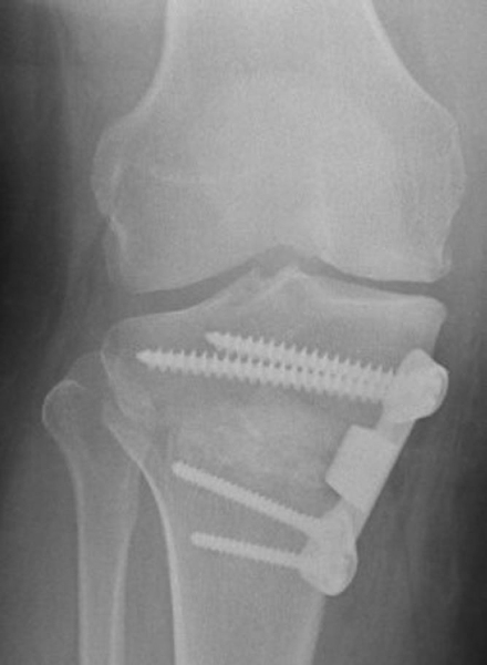 The patient is placed in a hinged knee brace that allows motion from 0 to 90 degrees of flexion. The patient is kept overnight for pain control and to work with physical therapy. The patient is kept touch-down weight bearing in the hinged knee brace for 6 weeks. The patient is encouraged to work on range of motion from 0 to 90 degrees in the hinged knee brace during this time. Plain films are obtained at 6 weeks postoperatively, and if adequate healing is apparent, progressive weight bearing is initiated. If the lateral cortex was violated during the operative procedure, the weight-bearing protocol is adjusted to include a longer interval of protected weight bearing. Total time for recovery and resumption of normal activities generally averages 6 months.
