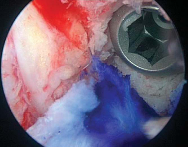 ). The femoral tunnel is smoothed, and the arthroscope is placed in the femoral tunnel and rotated 360 degrees to ensure that the posterior wall is intact (