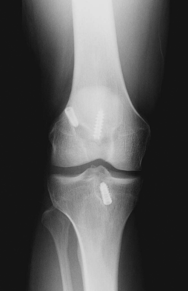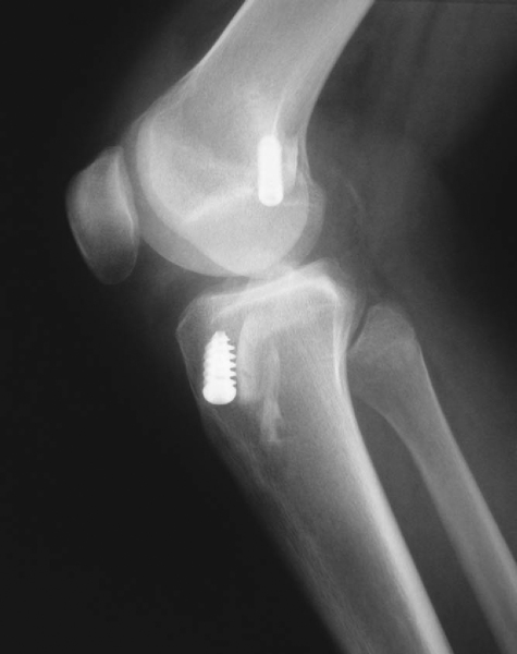 If bone stock is severely compromised because of extensive tunnel widening, primary bone grafting is advisable. All hardware is removed, and both tibial and femoral tunnels are filled with morcellized bone graft. After 4 months, the patient returns for staged ligament reconstruction.