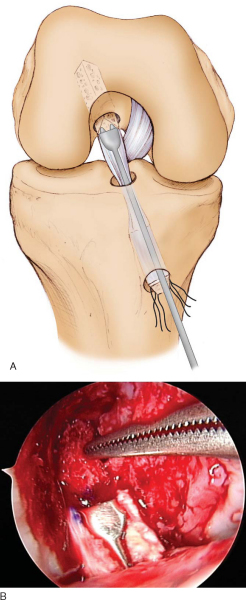 ). A cannulated acorn or solid fluted reamer is used to make the new tibial tunnel. A 10- or 11-mm reamer is generally used. If tunnel widening is suspected, some surgeons recommend use of a smaller reamer first, then placement of the arthroscope through the tunnel to examine the quality of the tunnel before it is sequentially enlarged to the desired width. Once the tunnel is made, the arthroscope can be passed up the tibial tunnel to assess for residual soft tissue (