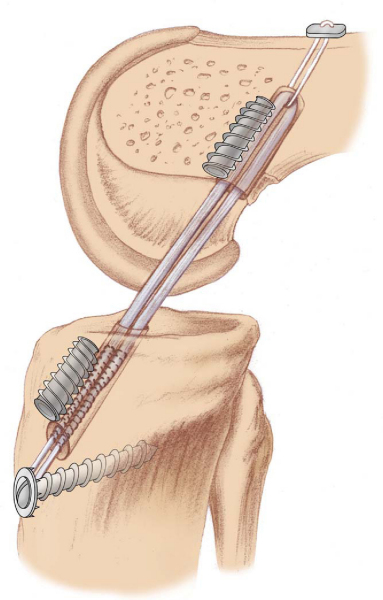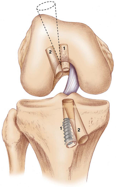 Intra-articularly, tibial tunnel orientation aims to avoid intercondylar notch impingement. In general, two types of aiming devices are available. One device creates a “point-to-point” placement of the preliminary drill pin; the other type of aimer drills the pin to the “elbow” of the aiming device (
