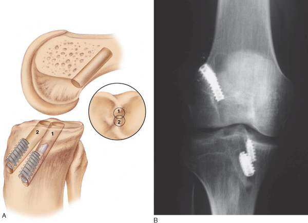 ). Graft choices include autograft and, more commonly, allograft to avoid the morbidity associated with iliac crest graft harvesting. Allograft bone chips or struts and bone left over from preparation of the tendon graft are commonly used. In the case of overlapping tibial tunnels, either bone graft or a larger tibial bone plug can be used to fill the defect and still allow interference screw fixation. Similarly, if the old and new femoral tunnels overlap, bone graft can be used to fill the defect left by the previous tunnel. To minimize extravasation of bone graft material into the joint, we found it helpful to use a clear shoulder-arthroscopy cannula or, alternatively, a 3-mL syringe with the front end cut off. The syringe is filled with morcellized bone graft, introduced through a slightly enlarged arthroscopy portal, and directed into the defect, and the bone graft is delivered by advancing the plunger. Other options include placing cortical allograft “matchsticks” into the defect and leaving the graft bone plugs sufficiently large to fill the tunnel defects. Alternatively, screws may be “stacked” to enhance bone plug fixation in overlapping or widened tunnels. Supplemental fixation (EndoButton, staples, post, suture button) on both the femoral and tibial sides should be strongly considered whenever secure graft fixation may be compromised by enlarged or bone grafted tunnels.