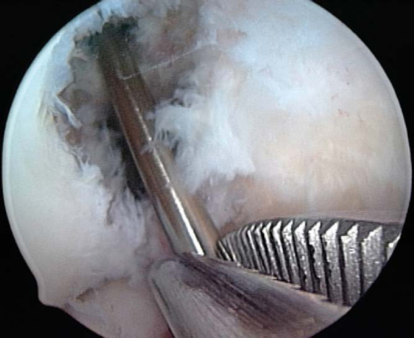 Intercondylar notch impingement and roof impingement are two common causes of ACL failure. At least 20 mm of notch width is necessary in the midtunnel region to avoid graft impingement. If a notchplasty is necessary, it can be performed with either a quarter-inch osteotome or a spherical bur. Alternatively, a curet can also be used. The notchplasty is performed from anterior to posterior and from apex to inferior. One should avoid elevating the apex of the notch (except if there are apical notch osteophytes) as the patella contacts this region in the extremes of flexion. A rasp can be used to smooth the wall of the intercondylar notch. After the notchplasty is performed, a probe is placed to palpate the over-the-top position. One should be able to hook this area easily with a probe; if the probe slides off the back edge, it is advisable to re-evaluate and to débride this area further.