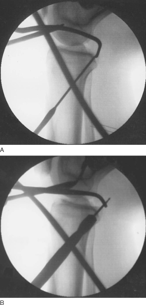 ). We use intraoperative fluoroscopy to verify the location of the graft. The lateral view is easily obtained with the knee in the figure-four position, and the leg is extended for the anteroposterior view.