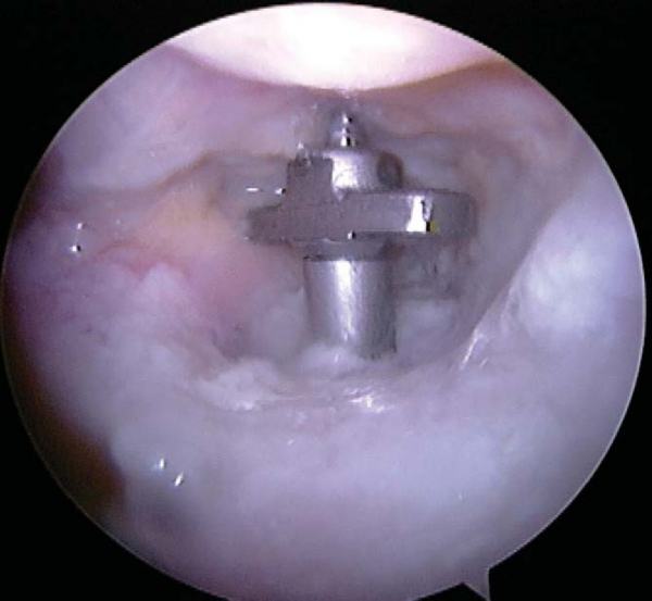 Brick Campbell and the senior author (J. K. S.) have developed an arthroscopic PCL inlay technique that has undergone successful in vitro preliminary testing.[20] Similar anterolateral, anteromedial, and posteromedial portals are made as previously described. The PCL footprint is prepared. Custom arthroscopic instrumentation is used to make two overlapping circular defects 12 mm in diameter and totaling 18 mm in length (Smith & Nephew, Inc, Andover, Mass). By use of a modified PCL tibial pin guide, two parallel pins are drilled from the anterior tibial cortex into the PCL footprint (
