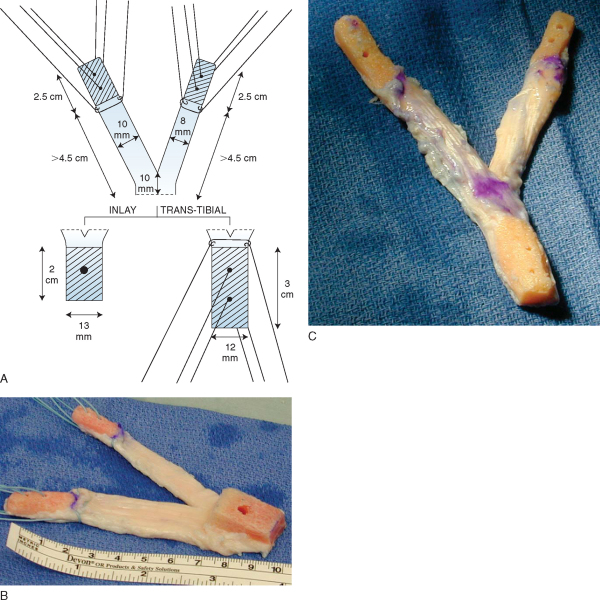 Figure 67-4 (A reprinted with permission from Sekiya JK, Kurtz CA, Carr DR. Transtibial and tibial inlay double-bundle posterior cruciate ligament reconstruction: surgical technique using a bifid bone–patellar tendon–bone allograft. Arthroscopy 2004;20:1095-1100.) |