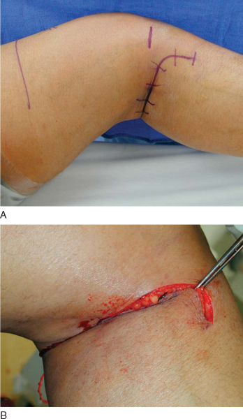). The dissection is continued through the subcutaneous fat down to the level of the sartorius fascia and the fascia overlying the medial head of the gastrocnemius. The fascia is incised along the palpable posteromedial tibial border. The semimembranosus and pes anserinus tendons are retracted anteriorly and proximally while the medial head of the gastrocnemius is elevated from the tibial cortex and retracted posteriorly. The medial border of the gastrocnemius is followed distally along the posterior tibia, and the proximal border of the popliteus muscle is identified (