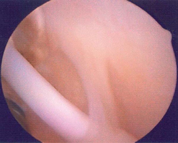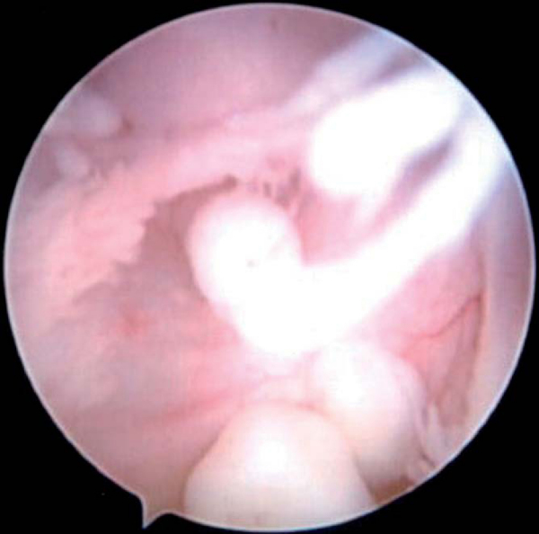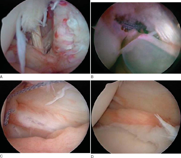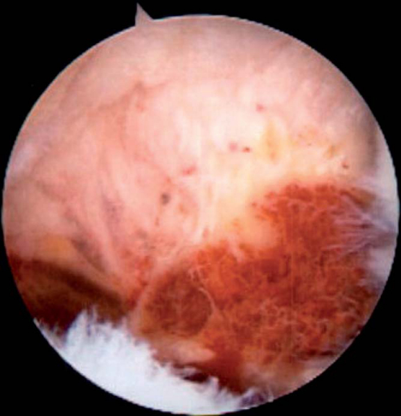), the multiple loose bodies are readily apparent. It may be useful to place a much larger cannula, such as that used in urologic procedures, to allow the loose bodies to be removed. It is important to find the area of synovium producing the lesions and to excise it. The most common area in which to find this synovium in my experience is the subcoracoid bursa and the bicipital groove.