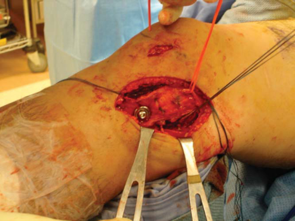 Reconstruction of the LCL is performed with Achilles tendon allograft or remaining graft from the bone–patellar tendon–bone allograft initially used for the ACL reconstruction. The bone plug is sized to 7 to 8 mm in diameter. The PLC is reconstructed with tibialis anterior allograft or hamstring autograft.