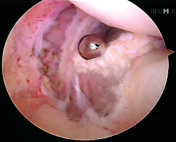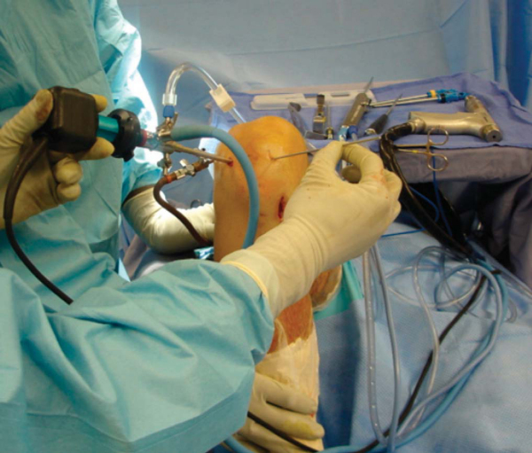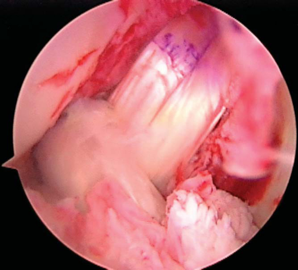 The arthroscopic equipment is prepared, and the fluoroscopy machine is later draped. A complete diagnostic arthroscopy is performed to assess for intraarticular pathologic changes, including inspection of the menisci and articular surfaces. The intercondylar notch is examined for any remaining intact bundles of the cruciate ligaments, which are preserved for augmentation.