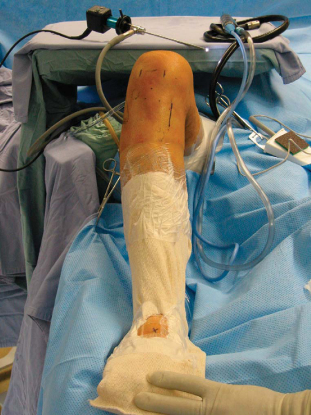 An examination under anesthesia is then performed. The nonoperative knee is examined, followed by the operative knee. The alignment and range of motion are assessed with specific attention to terminal extension and flexion. A thorough ligamentous examination is conducted to determine the patterns of laxity. Once the leg is prepared and draped, the dorsalis pedis artery is palpated and marked, and a hole is cut in the stockinette for access to the pulse throughout the case (