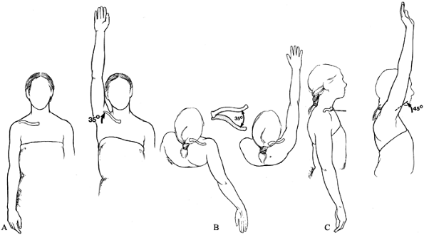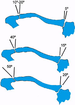 Figure 78.2. Variations of the inclination of the AC and the SC joints. (Redrawn from DePalma AF. Surgery of the Shoulder. Philadelphia: JB Lippincott.)