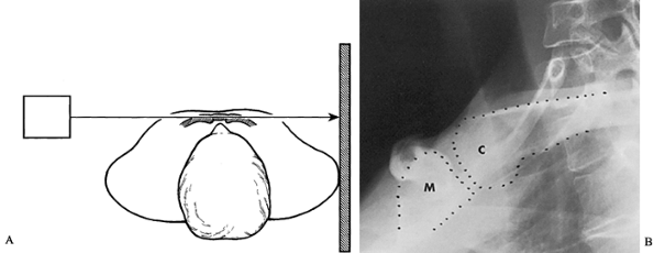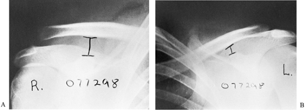 Figure 78.1. Anteroposterior view of the normal shoulder. Note the AC joint, the coracoid process, and the CC interspace.