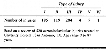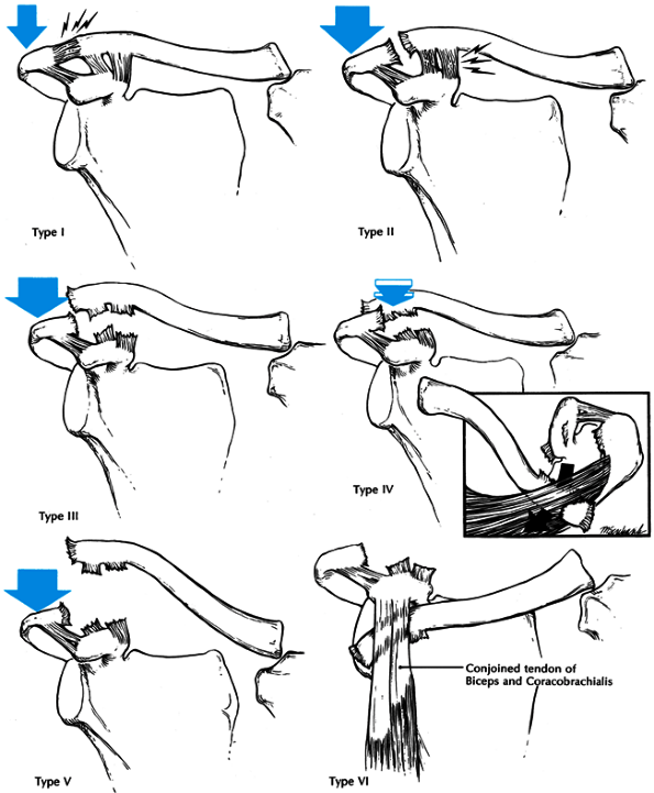 Originally, AC injuries were classified into only two or three grades (2,39,79). One of us (C.A.R.), however, has identified type IV, V, and VI dislocations, which are more likely to require surgery (186; Fig. 78.6; Table 78.1 and Table 78.2).
