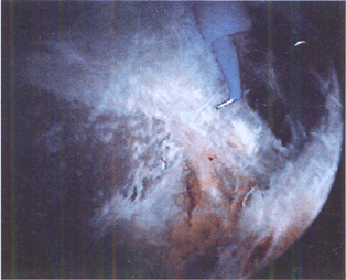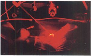 Photochemical treatment of a rabbit model of rheumatoid arthritis. Light delivered percutaneously to the anterior knee joint activates photochemicals that destroy the proliferative synovium. (This figure is printed in black and white as Figure 7 of Chapter 98.) |
