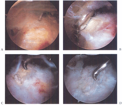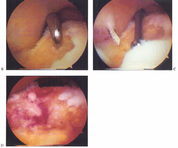 Figure 79.20. Calcific tendinitis. A: Note inflamed area on bursal surface of the supraspinatus, which corresponds to an underlying calcific deposit. B: Unroofing of the calcific deposit by gentle shaving. C: Full extent of the deposit. D: After complete debridement, the tendon remains intact. (This figure is printed in black and white as Figure 20 of Chapter 79.)