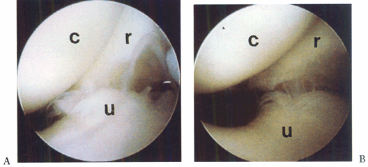 Figure 82.17. Arthroscopic view of the lateral compartment, demonstrating posterolateral subluxation of the forearm bones on the humerus. A: No stress. B: With stress. c, capitellum; r, radius; u, ulna (This figure is printed in black and white as Figure 17 of Chapter 82.)