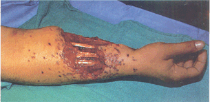 Gunshot wound to upper extremity with soft-tissue defect and exposure of tendons. (This figure is printed in black and white as Figure 3 of Chapter 35.) |