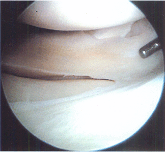 Incomplete tear of the superior surface of the lateral meniscus associated with an anterior cruciate ligament tear. (This figure is printed in black and white as Figure 2 of Chapter 85.) |