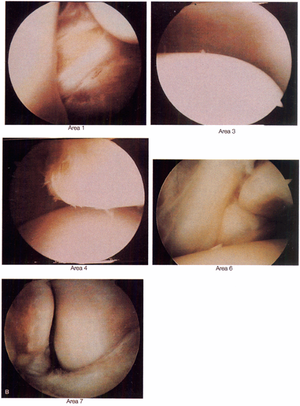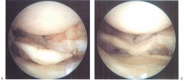 Figure 84.29. Arthroscopic view of the lateral compartment (A) presynovectomy and (B) postsynovectomy. (This figure is printed in black and white as Figure 29 of Chapter 84.)