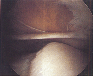 Figure 84.37. Medial plica viewed from superolateral arthroscopic portal. (This figure is printed in black and white as Figure 37 of Chapter 84.)