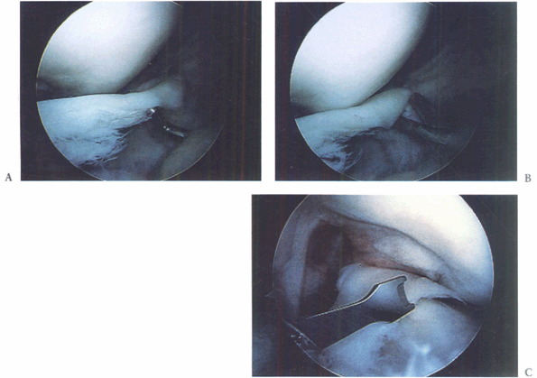 Figure 85.4. A: Displaced bucket-handle tear of the medial meniscus. B: Anterior horn of bucket-handle tear detached. C: