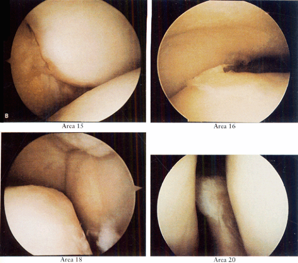 Arthroscopic views of points 15, 16, 18, and 20. (Copyright 1996 by Lippincott-Raven Publishers. From Ferkel RD. Arthroscopic Surgery: The Foot and Ankle. Philadelphia: Lippincott-Raven Publishers, 1996:114, with permission. Illustration by Susan Brust.) (This figure is printed in black and white as Figure 8 of Chapter 93.) |