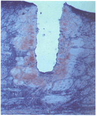 Thermal damage in meniscus after three shots at 1.5 J per pulse at a repetition rate of 1 Hz. Damage extends approximately 350 microns from the edges of the crater (trichrome stain, 40×). (This figure is printed in black and white as Figure 3 of Chapter 98.) |