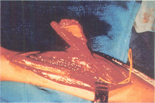 Figure 35.26. Venous congested flap treated with leeches. (This figure is printed in black and white as Figure 26 of Chapter 35.)