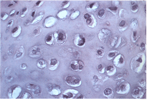 Grade I chondrosarcoma. The lesion is quite cellular, the nuclei are enlarged and irregular, and double nucleated cells are present. (This figure is printed in black and white as Figure 6 of Chapter 128.) |