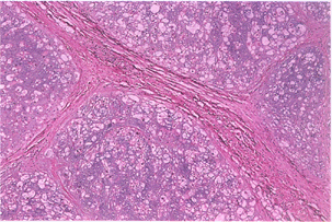 Typical appearance of chordoma. The tumor is divided into lobules with fibrous septa. Tumor cells float in a blue myxoid background. (This figure is printed in black and white as Figure 20 of Chapter 128.) |