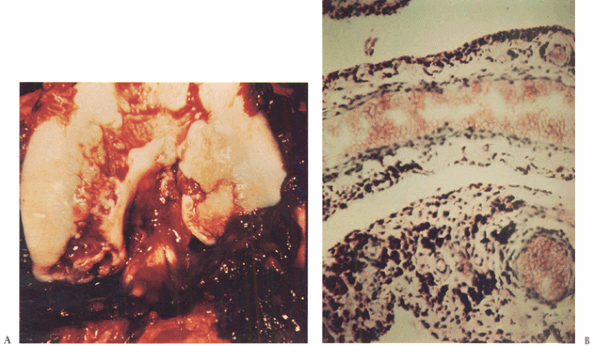 at the time of open synovectomy a few days after the x-ray studies were taken. There is extensive hyperplastic synovitis with full-thickness erosion of the articular surface of the weight-bearing surfaces of the medial and lateral condyles and the trochlea. This demonstrates the advanced destruction that can occur with chronic hemophilic synovitis despite a relatively benign-appearing x-ray study. B: Photomicrograph of the synovium from this patient showing hemosiderin pigment deposition on the surface taken up by the phagocytic synovial A cells. These cells migrate into the perivascular tissue of the subsynovial layer to return blood products to the general circulation. This patient was in the stage of chronic hemarthrosis, which is easy to understand with dilated venous channels immediately beneath the surface that are easily torn when the fragile, hypertrophic synovium gets caught between the eroded joint surfaces. (This figure is printed in black and white as Figure 2 of Chapter 136.) |