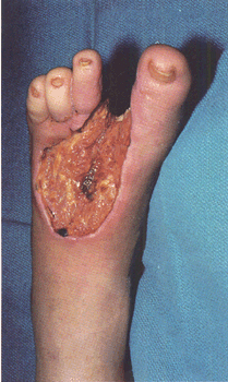 Figure 35.14. Diabetic foot infection. A: Dorsal view. (This figure is printed in black and white as Figure 14 of Chapter 35.)