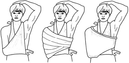 One application of Velpeau bandage using bias-cut stockinet is seen in Fig. 6-3. The common application of the typical sling-and-swathe bandage is shown in Fig. 6-4.