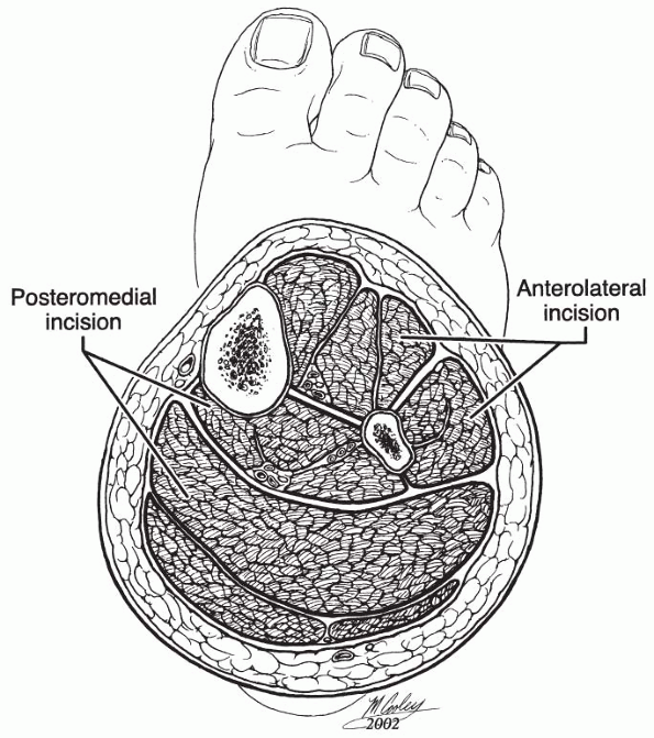The standard fasciotomy in the leg is performed through two longitudinal incisions, one on each side.