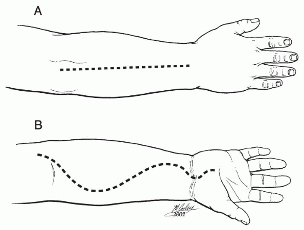 Figure 15-3 Surgical technique for fasciotomy of the forearm. (A) Dorsal incision. (B) Volar incision. (Adapted from Green NE, Swiontkowski MF, eds. Skeletal trauma in children. Philadelphia: WB Saunders, 1994:83.)