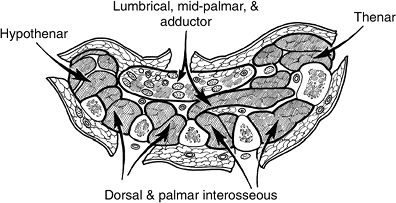 Figure 15-3 Cross section of the midpalm, depicting the thenar, adductor, interosseous, midpalmar, and hypothenar spaces.