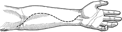 Figure 15-11 Midaxial incision for release of compromised digits in compartment syndrome.
