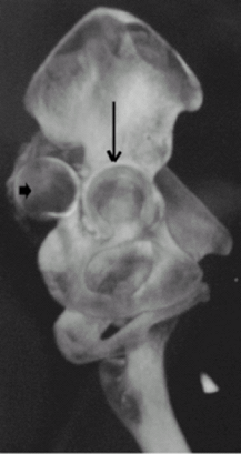 posterior dislocation of the right hip. The femoral head (short arrow) and empty acetabular fossa (long arrow) are marked. -