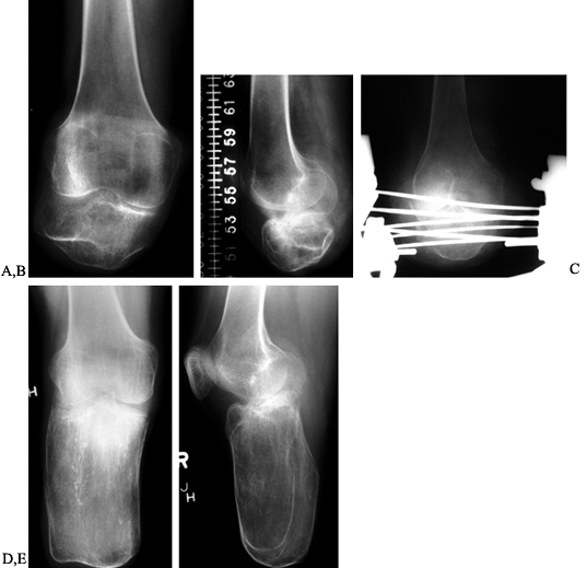 Figure 174.18. AP (A) and lateral (B) radiographs of a short, below-knee stump prior to lengthening. Lengthening in progress with an Ilizarov device (C). AP (D) and lateral (E)