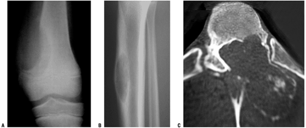 Figure 5.3-4 Radiographs of other cases of aneurysmal bone cyst in the distal femur (A), tibia (B), and vertebra (C).